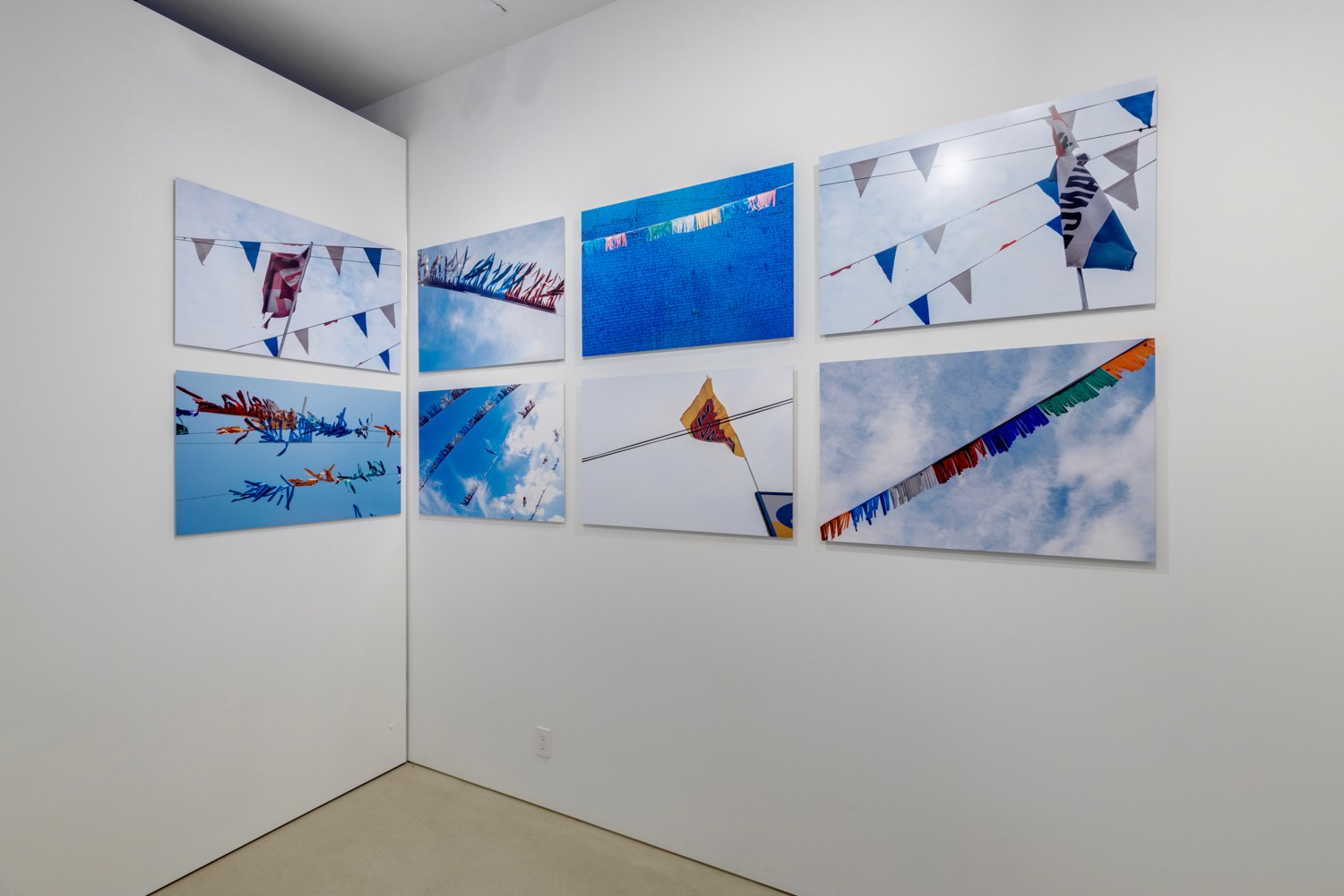 In the smaller gallery, the room is flooded with white light. Hung intentionally high, there is a grid of eight, large-scale photographs sliding around the corner. Printed on aluminum, they are beautiful stills of the car dealership flags seen in 3rd Avenue Car Dealerships. The colorful garlands, in various states of decay, proudly occupy the space, forcing you to look up at them as if they were strung across the gallery ceiling. Kaufman’s decision to print the photographs on aluminum emphasizes the materiality of cars, as well as her ability to play with disparate mediums.